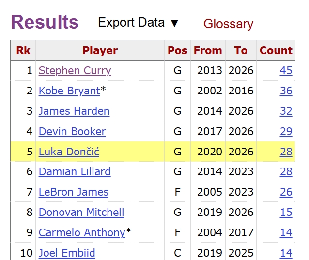 下一位,东契奇将追赶哈登(32次)。